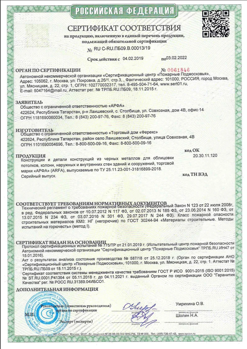 Российский завод-изготовитель металлических потолочных систем с сертификатами пожарной безопасности КМ0/КМ1. Производственная мощность — 7000 м²/сутки.