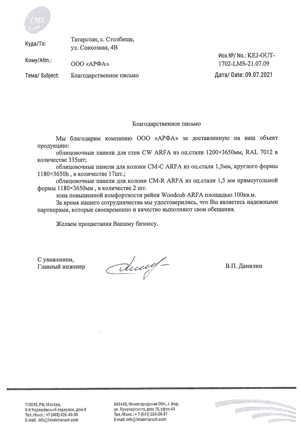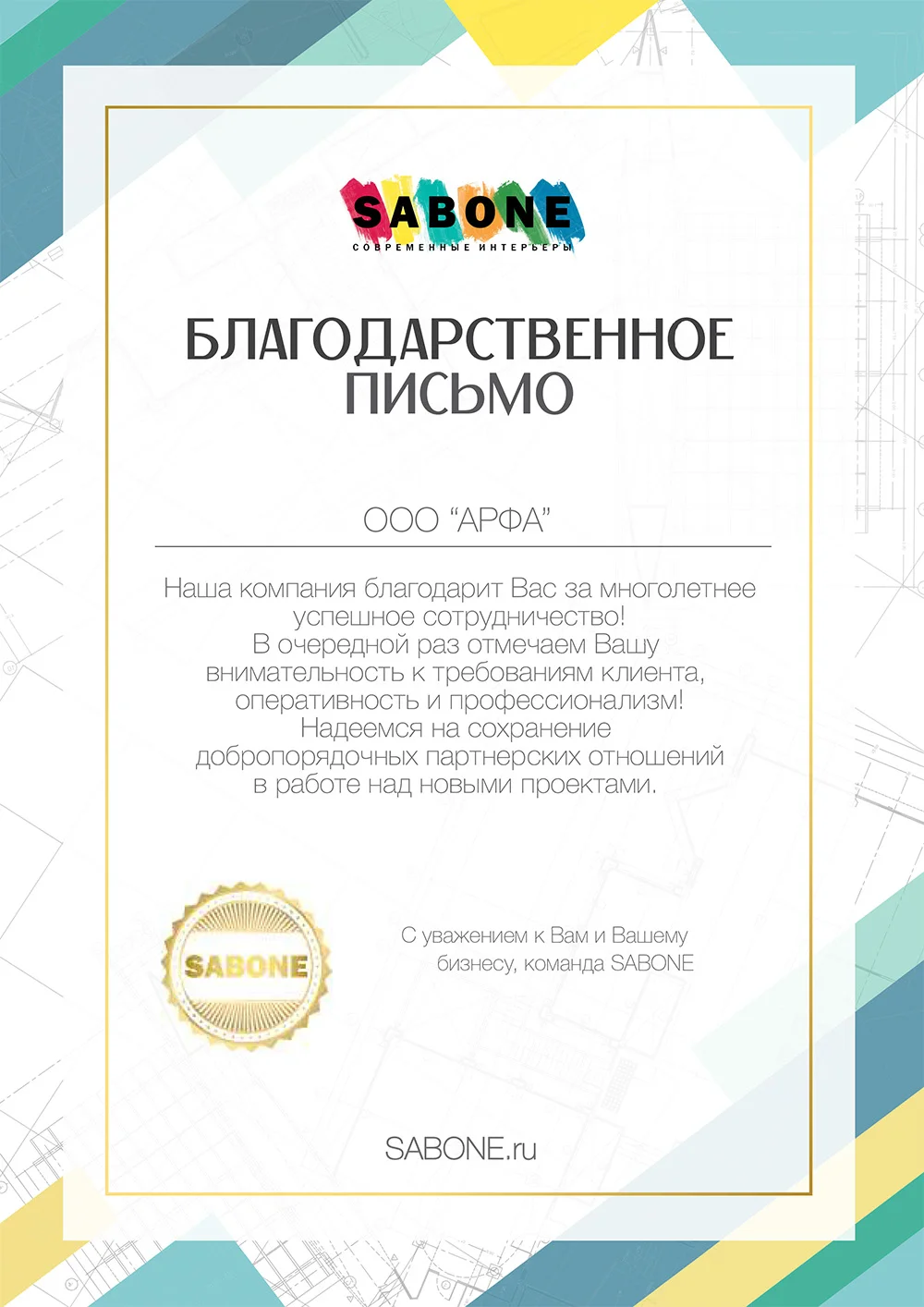 Наша компания благодарит Вас за многолетнее успешное сотрудничество! В очередной раз отмечаем Вашу внимательность к требованиям клиента, оперативность и профессионализм! Надеемся на сохранение добропорядочных партнерских отношений в работе над новыми проектами.