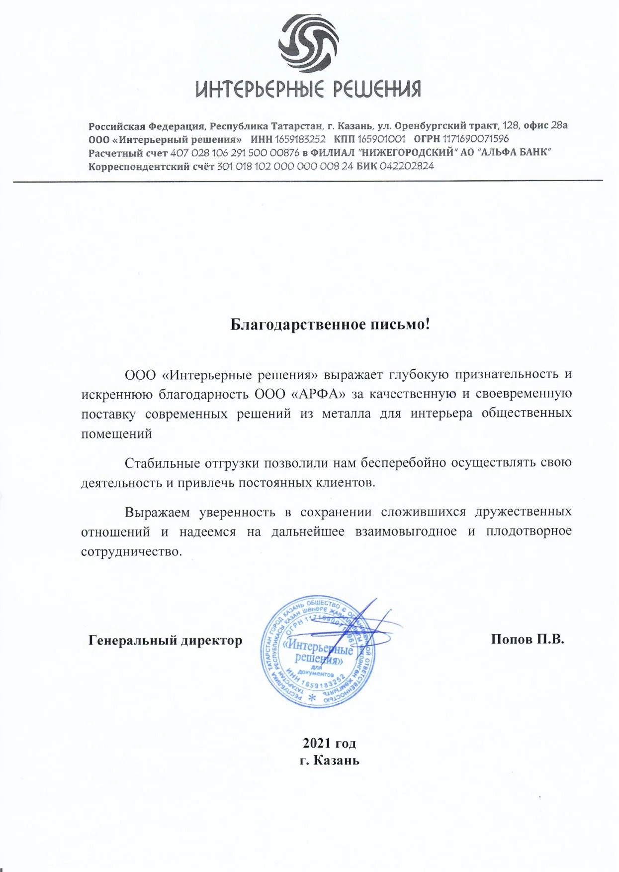 ООО «Интерьерные решения» выражает глубокую признательность и искреннюю благодарность ООО «АРФА» за качественную и своевременную поставку современных решений из металла для интерьера общественных помещений.